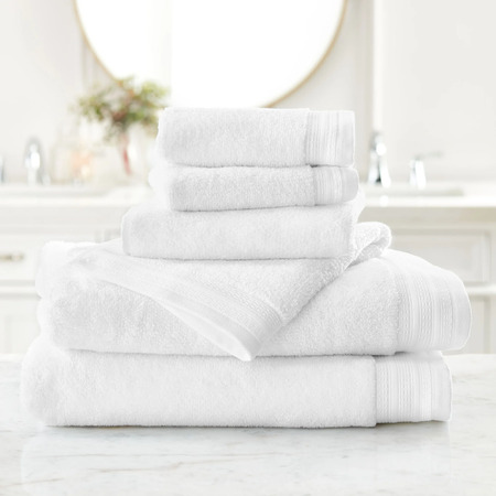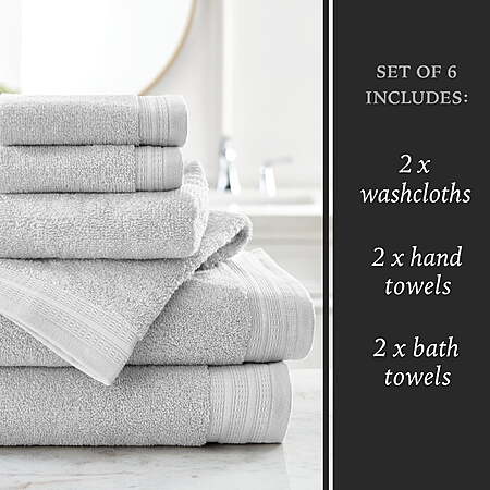 Product Description: | The timeless, solid pattern and super-soft feel of the Hotel Style 6-Piece Egyptian Cotton Tencel Lyocell Bath Towel Set in Platinum Silver will add style and comfort to any bathroom. This extra-absorbent, terry bath towel, hand towel, and washcloth set is designed with 70% Egyptian cotton, 30% Tencel Lyocell loops to soak up excess water quickly and provide superior softness, along with dobby borders for enhanced durability. Fade-resistant properties for a long-lasting, sleek light gray color are also featured. The set is machine washable and includes two bath towels measuring 56"L x 30"W at 550 GSM, two hand towels measuring 28"L x 16"W at 520 GSM, and two washcloths measuring 13"L x 13"W at 550 GSM, so it’s ideal for everyday use for adults and luxurious enough for all your guests. Or place it in a basket to give as a housewarming gift package. With a classic style that will complement any look, along with ultra-softness and absorbency, the Hotel Style 6-Piece Bath Towel Set makes a smart addition to any bathroom in your home. Includes: 2 bath towels, 2 hand towels, and 2 washcloths designed with 70% Egyptian cotton and 30% Tencel Lyocell loops for Extra sheen and Luxury Dimensions: 56"L x 30"W (bath towels), 28"L x 16"W (hand towels), 13"L x 13"W (washcloths) Features: Fade-resistant properties for long-lasting color Design: Traditional & timeless design that compliments any style Usage: For shower, bath, beach, pool, spa, or sauna Material: 70% Egyptian cotton/ 30% Tencel Lyocell Care: Wash before use, machine wash warm with like colors, do not bleach, remove promptly, tumble dry medium Oeko-Tex Made in Green Certification: This means this product has met high environmental safety standards and has been tested for harmful substances Available colors: Arctic White (white), Platinum Silver (light gray) and Marine Deep (dark blue) |