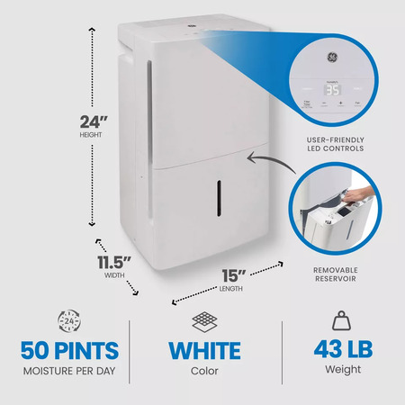 REFURBISHED, General Electric 50-Pint Portable Dehumidifier with Drain, White, 1 year warranty, $89.99, free shipping, ebay