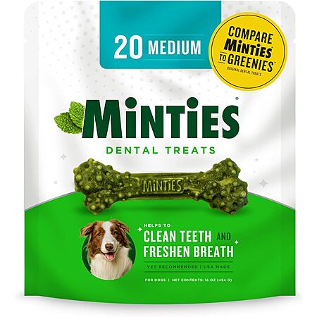Amazon has 20-Pack Minties Dental Dog Treats (Medium) for $9.94 - $2.98 when you 'clip' 30% Off coupon found on product page - $0.50 (5%) when you check out via Subscribe & Save = $6.46Shipping is free w/ Prime or on orders $35+.