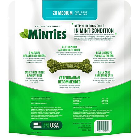Model: Minties Dental Chews for Dogs, 20 Count, Vet-Recommended Mint-Flavored Dental Treats for Medium Dogs 25-50 lbs, Dental Bones Clean Teeth, Fight Bad Breath, and Removes Plaque and Tartar