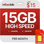 Infimobile via Amazon has 1-Month Prepaid Unlimited Talk & Text Plan + 15GB Data (Verizon or T-Mobile Networks) for $15 - 50% off w/ clipped coupon = $7.50. Shipping is free with Prime or on $35+ orders.