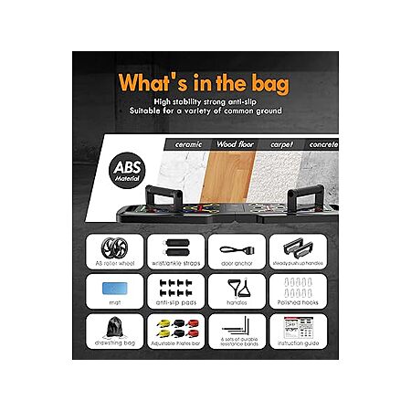 - Versatile home portable fitness device, We've kept the professional push up straining, Added foldable fitness bars and wrist/ankle straps, Ab roller wheel and 6 resistance bands so You can perform more exercises. Light but stable enough. You can choose the intensity according to your ability.