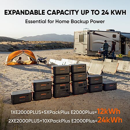 2kWh - 24kWh Flexible Expansion: The Jackery Explorer 2000 Plus supports up to 5 expandable battery packs, featuring power expanded from 2k to 12kWh. 2 * Jackery Explorer 2000 Plus Power Stations can be connected in parallel, to expand the capacity to 24k Wh, voltage to 240V and output to 6000W, matching all your power requirements - both indoors and outdoors.