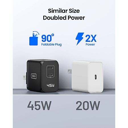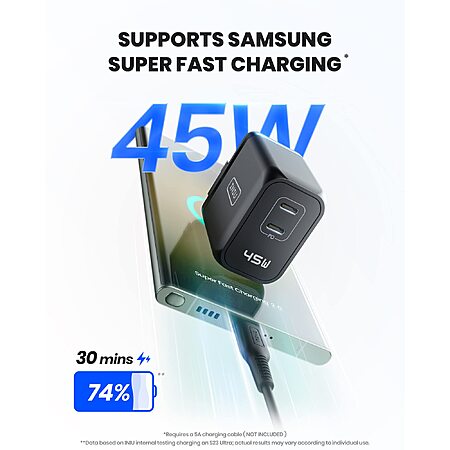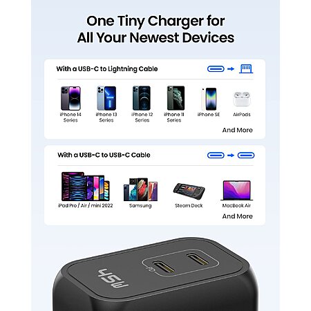 - [GaN 45W Speeds Up Per Charging] GaN 45W hits winningly even the newest devices' max power need, fuels iPhone 14 up to 89% or Samsung S22 Ultra to 92% in just 30mins, also flies MacBook Air to 71% with 1-hr charge—yet other 20W gets only 37%.