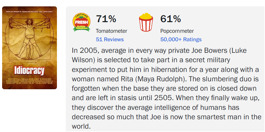 - From Mike Judge comes an outrageous sci-fi comedy that will make you think twice about the future of mankind. Meet Joe Bowers (Luke Wilson). He's not the sharpest tool in the shed. But when a government hibernation experiment goes awry, Bowers awakens in the year 2505 to find a society so dumbed-down by mass commercialism and mindless TV programming that he's become the smartest guy on the planet. Now it's up to an average Joe to get human evolution back on track!
