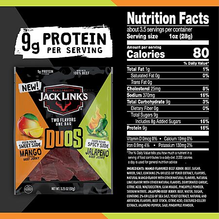 8-Count 3.25-Ounce Jack Link's DUOs Jalapeño and Mango Beef Jerky on sale for $36.22 - 25% off when you 'clip' the coupon on product page - 5% off when you checkout via Subscribe & Save =