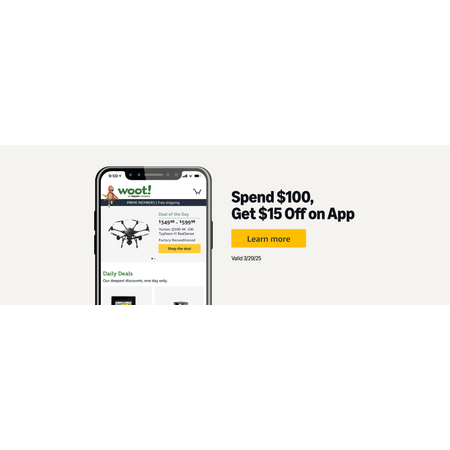 Limit of $15 maximum savings. Discount will be automatically applied at final checkout. Discount valid via the Woot! App only. This is open to everyone, not just Prime members.