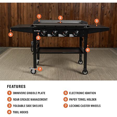 36" Blackstone 4-Burner Omnivore Gas Griddle w/ Folding Side Shelves (1554/Black) on sale for