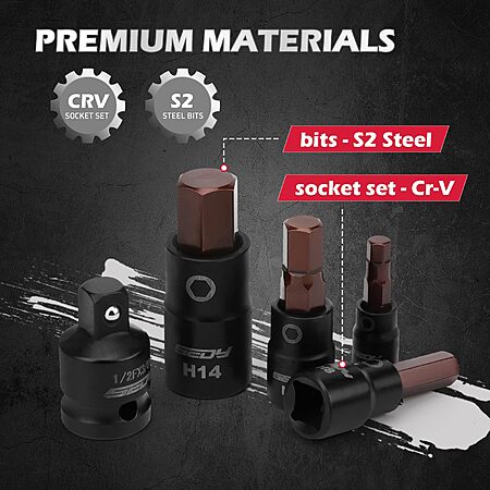 • PREMIUM MATERIALS - 16-piece Metric Hex bit socket set crafted from high-quality S2 alloy steel and Cr-V steel for superior torque, durability, and performance, suitable for DIY enthusiasts and professionals