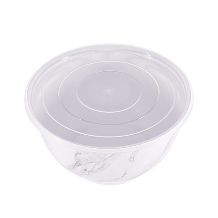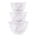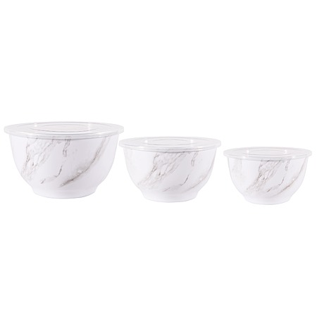 Add style to your serve ware and dinnerware collection with the Better Homes & Gardens 6-Piece Melamine Serving Bowl Set with Lids. Showcasing an elegant faux marble design, this round serve bowl set is sure to impress while you are entertaining or enjoying a meal at home. The beauty and sophistication of the marble design offers a functional and beautiful meal presentation to your table. Designed to mimic the look and feel of traditional ceramic, this round serve bowl set is made of BPA- free melamine with durability to withstand drops and dishwashers. Set includes a 10.625-inch diameter bowl, 9.50-inch diameter bowl, and an 8.375-inch diameter bowl, each with lids. Once you are ready to put them away, simply stack these functional bowls together. The nested design makes for convenient and compact storage which saves space in your cabinets or pantry. All 3 bowls feature a silicone non-skid base.
