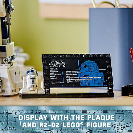 - Room décor display with an R2-D2 information plaque and a stand decorated with the LEGO Star Wars 25th Anniversary logo for the Darth Malak LEGO minifigure