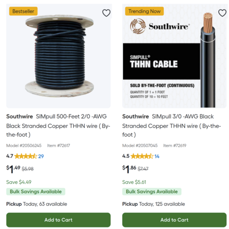 or for 200 Amp: https://www.lowes.com/pd/Southwir...ot/3129327 ($3.63 a foot), Ground https://www.lowes.com/pd/4-Gauge-...ot/3345460 $5.62 a foot, $5.02 for 200+ feet