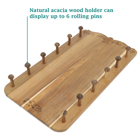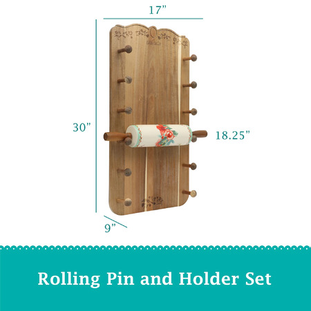 | Product Description: | The Pioneer Woman Painted Meadow 2-piece Rolling Pin Set combines functionality with vibrant design, bringing a touch of rustic charm to your kitchen. The rolling pin features a unique floral pattern for a splash of color and character to your usual baking routine. It features sturdy acacia wood handles that offer a comfortable grip. The natural wood finish feels smooth in your hands, ensuring ease of use even when working with heavier doughs. They provide control and precision needed to achieve the desired thickness for pies, cookies or homemade pizza. The smooth surface of the rolling pin glides effortlessly over the dough, helping you roll it out evenly without sticking. This design ensures that your baking experience remains enjoyable and hassle-free. The set includes one stoneware rolling pin and one acacia wood rolling pin rack. When not in use, the rolling pin make for a beautiful decorative piece displayed on the acacia wood rack. Made from rustic acacia wood, the rack can have up to six (6) rolling pins. Raised knobs provide a safe space to hold each rolling pin securely. The built-in metal loop at the back mounts the holder on the wall for easy installation. When not in use, it spruces up any kitchen or prep space as it blends seamlessly with other Pioneer Woman kitchenware. Ideal for both beginner bakers and seasoned pros, this rolling pin set provides durability and style. The set makes an excellent gift for anyone who enjoys baking, whether for everyday use or special occasions. It caters to a variety of tasks, from rolling out thin crusts to handling larger doughs for pastries, pasta or bread. Meet Ree: Ree Drummond is a NY Times Best Selling Author, TV personality, social media phenom, and the woman behind the popular Pioneer Woman lifestyle blog that started it all. She's also a lover of butter, basset hounds, Ethel Merman, her hunky, cowboy husband Ladd, and their four kids. Her casual country style and delicious recipes have made her a go-to for all things cooking and entertaining. A set includes one 17-inch rolling pin and one rolling pin holder. The rack measures 30 x 17 x 9 inches. Ceramic rolling pin features bold floral designs for added visual charm Acacia wood handles are sturdy for a controlled grip The holder can display up to six (6) rolling pins Natural, grained finish brings a rustic appeal to any kitchen Raised knobs provide enough space to hold each rolling pin securely Ready to hang using the built-in metal loop Stoneware material rolls easily over dough Vibrant floral design with acacia wood handles Adds color and charm to your kitchen Hand wash only Coordinates with other kitchen essentials from The Pioneer Woman collection |