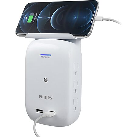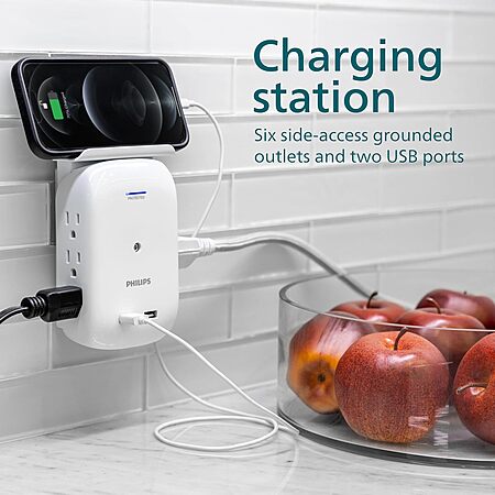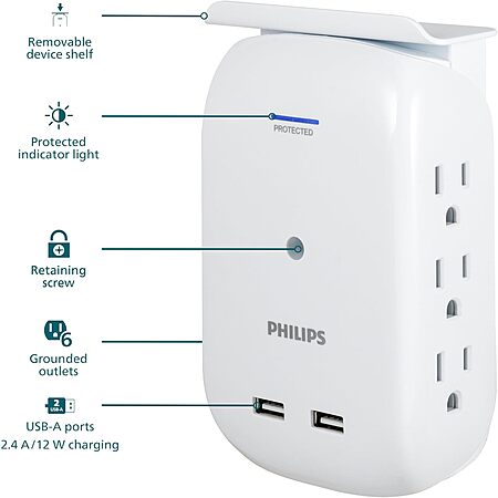 Philips 6-Outlet Power Tap with Device Shelf + 2 USB Ports (450J,White) $13 + Free Shipping w/ Prime or on $35+