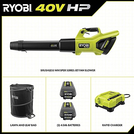 Complete tough yard tasks with this 40V 40V HP Brushless Whisper Series 190 MPH 730 CFM Cordless Leaf Blower and Lawn & Leaf Bag w/ (Two) 4.0 Ah Battery & Charger. This blower operates at just 57 dB, so you can complete yardwork at any time of day. It also features 730 CFM of clearing power and a touch-sensitive trigger so you can easily select the output of air. You can also use the speed tip to allow the blower to reach up to 190 mph to quickly clear areas of yard debris. The cruise control function allows you to maintain speed without pressing the trigger. There's also the turbo button to release more power from the blower. It's made with a brushless motor for high-quality power and performance. Two batteries are included for extended runtime. A five-year warranty is included.
