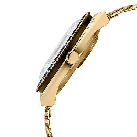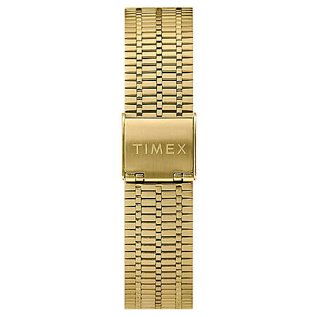 - Timex TW2U61400ZV men's Q Reissue gold tone bracelet quartz watch is offered, in a yellow gold plated solid stainless steel case. This model is made in dimensions of 38mm across and 12mm high. This watch has a unidirectional rotating blue and black accented gold tone bezel and a textured push/pull main crown. Timex TW2U61400ZV is equipped with a yellow gold plated stainless steel bracelet. Securing the bracelet is a fold over clasp made in stainless steel.