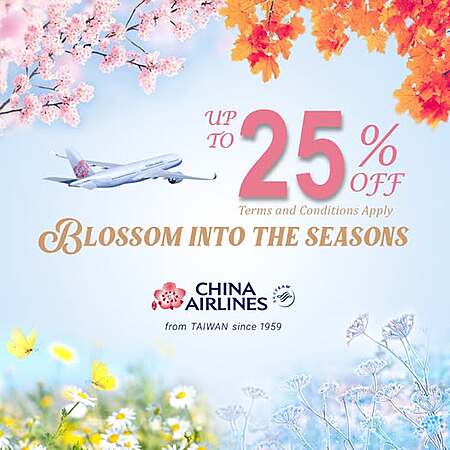 China Airlines Spring sale is a savings of up to 25% on airfares . Discount valid on economy, premium economy or premium business class tickets. Departures from LAX, ONT, SFO, JFK or SEA.