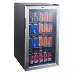 Keep your drinks, snacks and other party necessities cool in the Whirlpool Mini Beverage Refrigerator. This compact refrigerator offers a generous 3.6 cubic feet of storage space that allows you to place it just about anywhere. This convenient mini fridge is perfect for additional kitchen space or lower level family room entertaining. If placing the cans in the beverage center vertically, the unit holds 90 cans, if horizontally, it will hold 109 cans.