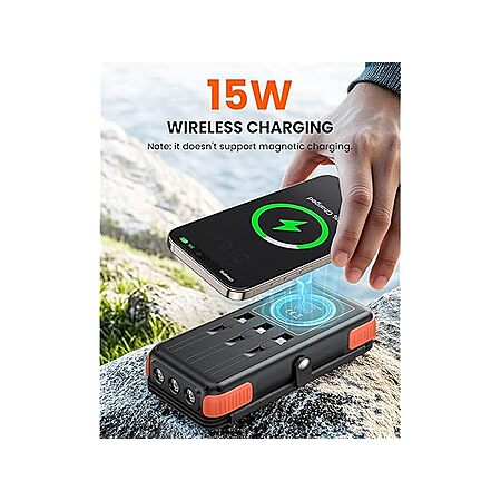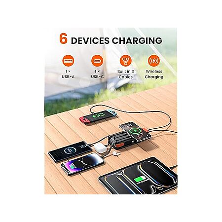 Features:- Built-in 3 cables (USB-C IN/OUT Cable*1 & Light-ning Cable*1 & Micro USB Cable*1), dual USB Ports and a wireless charging pad (15W Max), you can charge up to 6 devices at the same time