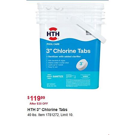 HTH 3" Chlorine Tablets for Pool Sanitization, 40 lbs., $119.99