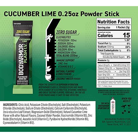 Amazon [amazon.com] has 15-Count BODYARMOR Flash I.V. Electrolyte Packets (Cucumber Lime) for $8.96 - 15% when you 'clip' the coupon on product page - 10% when you check out via Subscribe & Save = $6.72.