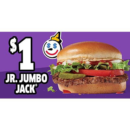 Offer includes one (1) Jr. Jumbo Jack or Jr. Jumbo Jack Cheeseburger for $1, plus tax. Offer valid on mobile app and online orders only. While supplies last, at participating Jack in the Box restaurants. One offer per order. Not valid with any other rewards or offers. Expires 4/15/25