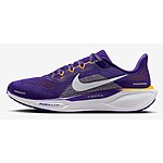 Responsive cushioning in the Pegasus provides an energized ride for everyday road running. Experience lighter-weight energy return with dual Air Zoom units and a ReactX foam midsole. Plus, improved engineered mesh on the upper decreases weight and increases breathability. Key Features:Upgraded breathable engineered mesh upper ReactX foam midsole surrounds forefoot and heel Air Zoom units for an energized ride. Signature waffle-inspired rubber outsole for traction and flexibility Plush collar tongue and sockliner for a secure and comfortable fit What's new? All-new ReactX foam midsole is 13% more responsive than previous React technology. Crafted for performance and planet, ReactX foam is engineered to reduce its carbon footprint by at least 43% in a pair of midsoles due to reduced manufacturing process energy compared to prior React foam. The carbon footprint of ReactX is based on cradle-to-gate assessment reviewed by PRé Sustainability B.V and Intertek China. Other midsole components such as airbags, plates or other foam formulations were not considered. Product Details:Weight: Approx. 297 g/10.4 oz (Men's US 10). Heel-to-toe drop: 10 mm. MR-10 Last - Our best, most consistent fit (same as Pegasus 40). Reflective details. Not intended for use as Personal Protective Equipment (PPE). Style: FZ5126; Color: Court Purple/White/University Gold/White; Size: 4; Gender: Male; Age Group: Adult | LSU Pegasus 41 Men's Nike College Road Running Shoes in Purple, Size: 4 | FZ5126-500