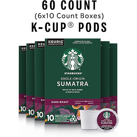 Starbucks K-Cup Coffee Pods, Dark Roast Coffee, Sumatra for Keurig Brewers, 100% Arabica, 6 boxes (60 pods total) $34.98