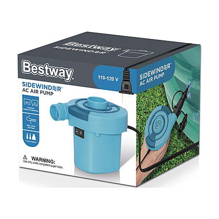 The Bestway® Sidewinder™ AC Air Pump is a useful accessory for anyone that owns inflatable items and wants to inflate or deflate them in a quick, convenient way. The Sidewinder AC pump comes with 3 multi-purpose valve adapters that will work with almost all inflatable items, including airbeds, pool toys, camping mats, floats and more. Quickly and easily switch between the inflation and deflation functions, making this pump a useful necessity for any of your needs. The attractive two-color design makes it a stylish accessory for inflatable items. Great for in home use, with a standard 110-120 V wall plug outlet. 110-120V electric pump Easily switches between inflation and deflation Includes valve adaptors, making it great for use with a variety of different inflatable items Attractive two-color design Contents: 1 Sidewinder electric air pump
