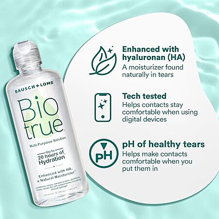 - Inspired by the biology of the eye, Biotrue contact lens solution contains hyaluronan (HA), a moisturizer found naturally in tears; and matches the pH of healthy tears to help make contacts comfortable when you put them in.