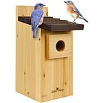 I love putting up bluebird boxes. I have helped a lot of bluebirds have clutches babies throughout the years. These boxes don't last long because I don't seal them or anything with chemicals, but usually I can get them cheaper at Walmart. It just depends, but this is a nice one for the price. The last one I got had a metal roof which helped a lot, especially keeping the predator birds from trying to stick their heads in and kill the baby birds. They slide off because it's metal. But I hope more people put more of these boxes out. It's a real fun thing to watch.