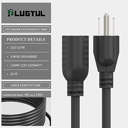 Model: PLUGTUL Outdoor Extension Cord 25 FT Waterproof, 16/3 Gauge Black Heavy Duty 3 Prong Extension Cord, 13A 1625W SJTW, ETL Listed, Great for Garden and Home
