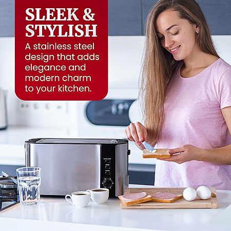 Model: Elite Gourmet ECT-3100 Long Slot 4 Slice Toaster, Reheat, 6 Toast Settings, Defrost, Cancel Functions, Built-in Warming Rack, Extra Wide Slots for Bagels & Waffles, Stainless Steel & Black
