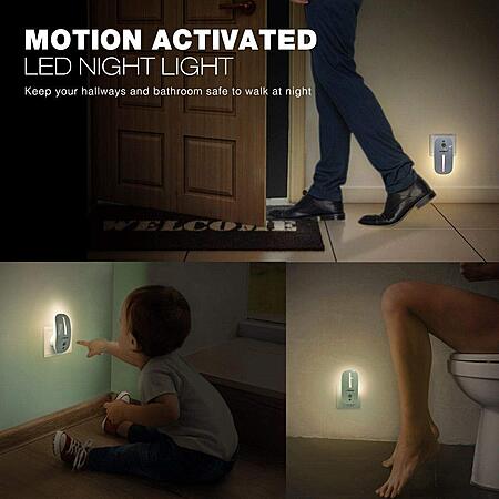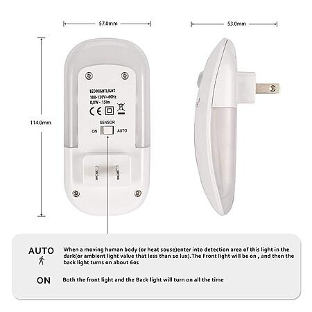 【Two Modes】:"ON" both lights are on and works as a normal night light. "AUTO" works as a sensor night light. Front light stays on when the room is dim or dark, back light turns ON when motion sensed with 8.2ft sensing range and Auto off after 60s of inactivity.
