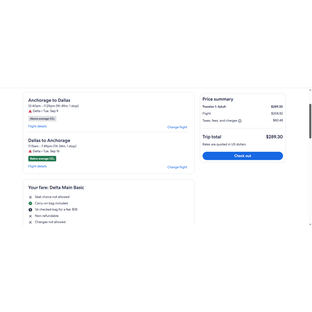 Delta Air Lines, Alaska Airlines and Expedia have round trip airfares travelling to and from Anchorage Alaska (ANC) and Dallas TX (DFW) for $290, making 1 stop both ways. These are basic economy fares that allow a personal item and a carry-on bag. There is no seat selection and no change.