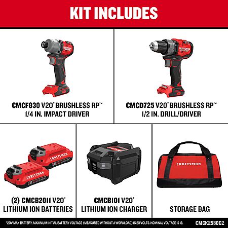 2-Tool CRAFTSMAN V20 Brushless Power Tool Kit w/ 2 Batteries, Charger & Case
