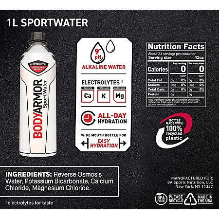 Model: BODYARMOR SportWater Alkaline Water, Superior Hydration, High Alkaline Water pH 9+, Electrolytes, Perfect for your Active Lifestyle, 1 Liter (Pack of 6)