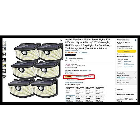 Model: Aootek New Solar Motion Sensor Lights 120 LEDs with Lights Reflector,270° Wide Angle, IP65 Waterproof, Step Lights for Front Door, Yard, Garage, Deck (Front Button 6-Pack)