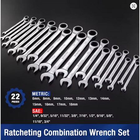 - 22 pieces metric and SAE ratchet wrench sets include 6mm, 8mm, 9mm,10mm, 12mm, 13mm, 14mm, 15mm, 16mm, 17mm, 18mm, 1/4", 9/32", 5/16", 11/32", 3/8", 7/16", 1/2", 9/16", 5/8", 11/16" and 3/4" combination wrenches, which meet most of your needs. And each wrench has clear dimensioning for quickly identifying the size you need.