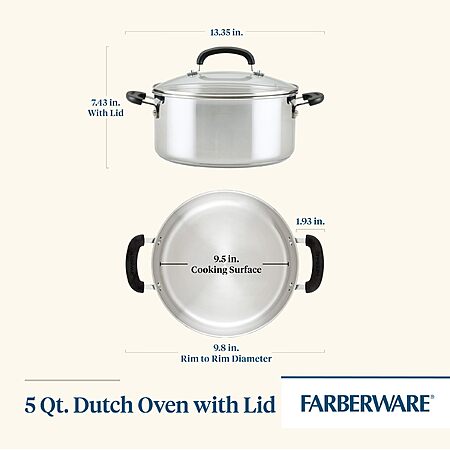 Model: Farberware Brilliance Stainless Steel Dutch Oven/Casserole Pan with Glass Lid, 5 Quart, Dishwasher Safe and Induction Ready, Compatible with All Cooktops, Stainless Steel