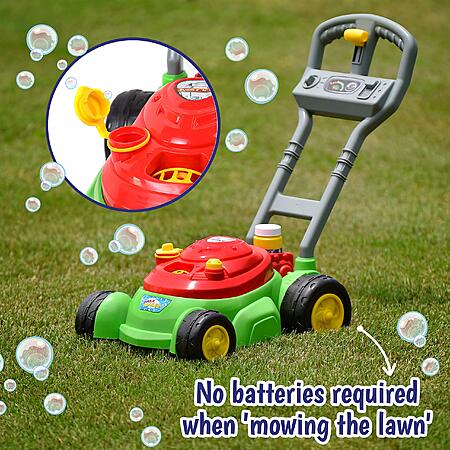 - PUSH BUBBLE TOY: Just push the mower and have fun with bubbles in seconds! No batteries required. As the mower is pushed, it releases tons of incredible bubbles into the air.