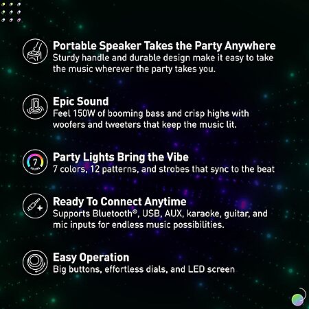 • Easy to Use and Looks Great: Sync flashing lights to music with 7 colors and 12 patterns, plus two strobe lights for extra fun; intuitive controls with big buttons, dials, and an LED input screen make operation simple—no fiddly switches, just easy access to your favorite tunes