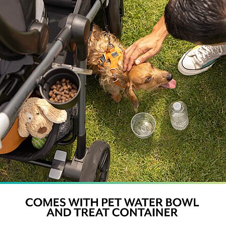- Includes a BPA-free child snack tray, parent cup holder with integrated waste bag holder (load with your own bags), pet water bowl and treat container with lid