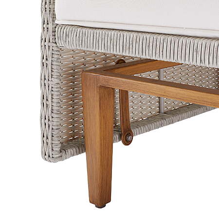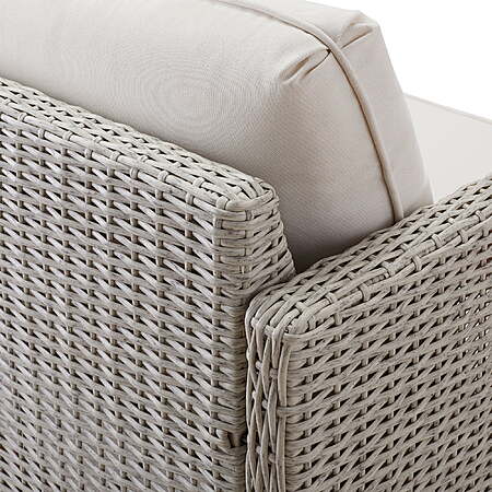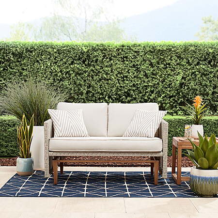 Better Homes & Gardens Davenport Outdoor Loveseat Glider Bench - White and Grey ul> Crafted from woven high-density polyethylene wicker in a weather resistant weave Mimics wicker's natural look E-coated and powder-coated metal frame for rust-resistant durability Updated design of a classic glider compliments many spaces Both frame and cushions are water and stain resistant Superior fade-resistant cushion covers for long wear and durability Solution dyed 50% recycled fabric is kind to the environment Estimated weight capacity 250 lbs per seat Recommended for outdoor use Assembly required Color: Multi Assembled product dimensions: 47" x 28.75" x 19.30" Product materials: Polyester, acacia wood, steel, polyethylene Model # BHG01