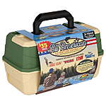 | Product Description: | Flambeau Outdoors All American Fishing Tackle Kit 63 piece, Grab a rod and head to the water to start the adventure. Featuring premium, tackle essentials from four iconic fishing brands, this special Flambeau Outdoors tackle box includes the fish On. 101 educational guide book for learning how to fish anywhere in the country for the nation's most popular species. Fishing Tackle Box, Bait Storage, Family Fishing includes Lures Flambeau Outdoors 2-tray Classic Tackle Box: The iconic cantilever 2-tray design provides 15 tackle compartments with 6 removable dividers. Flip-top lid accessory compartment and increased base storage volume for bulk tool storage. Bullet Weights: 15 SZ-7 Removable Split Shot, (2) ½ oz. Egg Sinker, (2) ¼ oz. Worm Weight Eagle Claw: Hooks, Jigs, & Swivels: 6 SZ-3 Black Barrel Swivel, 8 SZ-6 Offset Baitholder, 2 1/0 Lazer Sharp Wide Gap, 2 1/0 Offset Lazer Sharp Kahle, 6 SZ-2 Aberdeen, 2 2/0 Offset Baitholder, 2 3/0 Lazer Sharp Wide Gap Worm, 2 1/8 oz. Ball Head Jig Chartreuse Yum: Soft Plastic Baits: 2 7.5 Ribbon tail Worm Green Pumpkin/Purple Flake, 2 4 Dinger Worm Green Pumpkin/Purple Flake, 2 7.5 Ribbon tail Worm June bug, 2 4 Dinger Worm June bug, 2 2 Grub Smoke/Silver Flake, 2 1.5 Grub Chartreuse Dimensions: 14 L x 8.16 W x 7.57 H Thill: Floats: 1 ¾ Oval Spring Float, 1 Oval Spring Float Fishing Tackle Box, Tackle Box, Tackle Kit, Lure Storage |