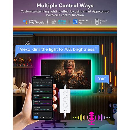 - [Multiple Control Ways]: You can control the strip light via 3 ways, using Smart Life APP, control box on the USB cable or intelligent voice control through Alexa and Google Assistant, setting the light colors, brightness and modes; Equipped with timer function, the light can be turned on automatically at the preset time to provide a fantastic lighting effect to suit your mood, creating ambience for birthday party, holiday, Halloween, Christmas, Valentine's Day and special events