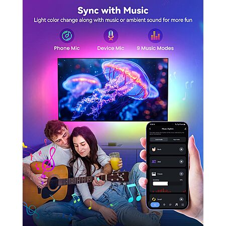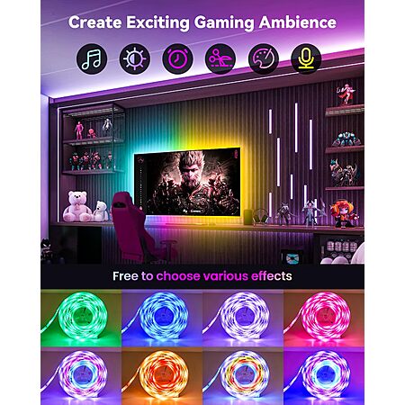 - [Preset Scenes & Music Sync Mode]: This LED strip light features 44 preset scene modes for making various dynamic lighting effects and creating a stunning background light for watching movie, having intimate gatherings or lively parties; With a built-in high-sensitivity mic in the control box, the strip light syncs with the music and follows to the voice rhythm for showing vibrant and flowing light, helping you to make immersive sound and light experience at home