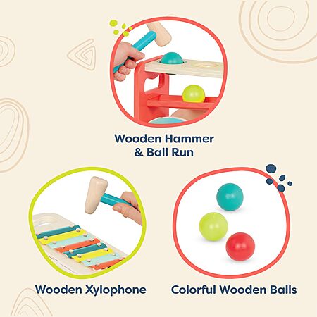 - Includes: This set comes with a pounding bench, xylophone, wooden hammer, and 3 wooden balls.