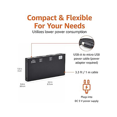 • Includes an HDMI 1-in-2-out splitter, 3.3-foot USB-A to micro USB power cable (USB power adapter not included), and user manual