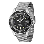 Stainless steel case with a stainless steel mesh bracelet. Uni-directional rotating aluminum and stainless steel bezel. Black dial with silver-tone Mercedes-logo and Breguet-style shape hands and index hour markers. Minute markers around the outer rim. Dial Type: Analog. Luminescent hands and markers. Date display at the 3 o'clock position. Miyota Caliber 8215 Automatic movement, containing 21 Jewels, beating at 21600 vph, and has a power reserve of approximately 42 hours. Scratch resistant mineral crystal. Screw down crown. Transparent see through case back. Round case shape, case size: 40 mm, case thickness: 14.10 mm. Band width: 20 mm, band length: 8 inches. Buckle clasp. Water resistant at 200 meters / 660 feet. Functions: date, hour, minute, second. Pro Diver Series. Casual watch style. Watch label: Japan Movt. Invicta Pro Diver Automatic Men's Watch 47721.